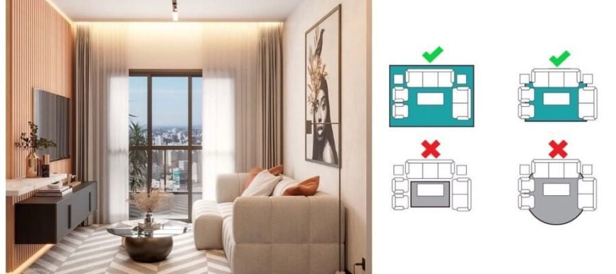 Tip: To avoid making the wrong combination: if the sofa is striped or patterned, it is preferable to opt for rugs in solid colors and neutral tones, such as beige. If the environment is cleaner and more essential, use a printed tapestry and give more color to the space! And choose carpet models that are larger than the size of the sofa, as this makes it easier to fit the other furniture into the room.